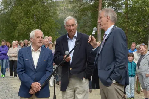 Ordfører i Rindal Ola T. Heggem intervjuer Harald Grønningen og Magne Myrmo under åpningen av skimuseet i Rindal 29. juni 2014. Foto Tor Helge Solli