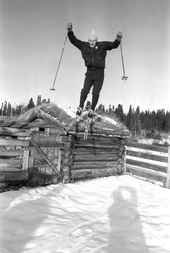 Ole Ellefsæter hopper fra et stabbur til ære for fotografen. Han har Landsemski på beina. Bildet er tatt på Skjæringfjell i november 1966. Foto: Ivar Aaserud Aktuell / NTB